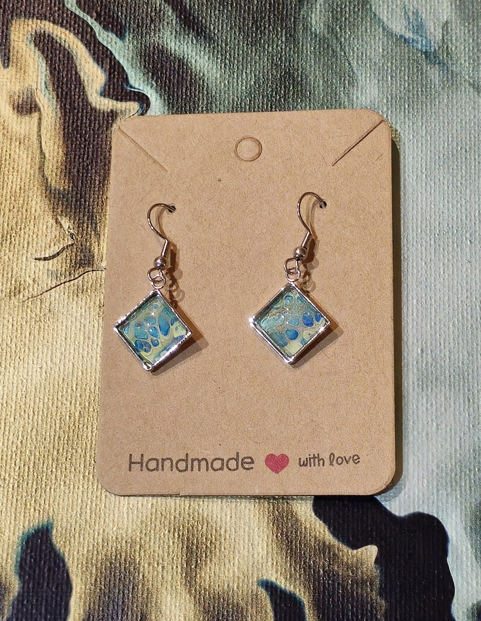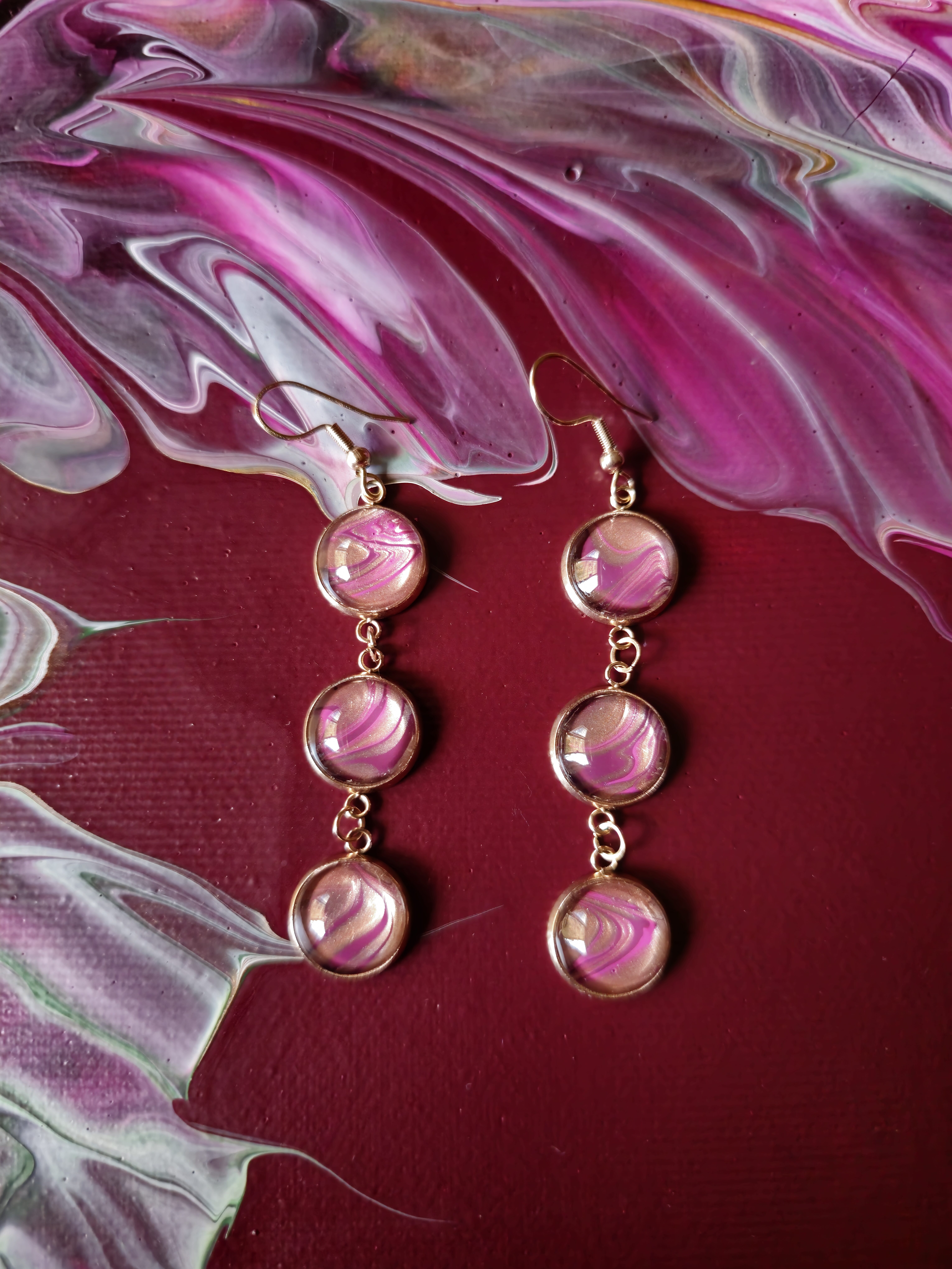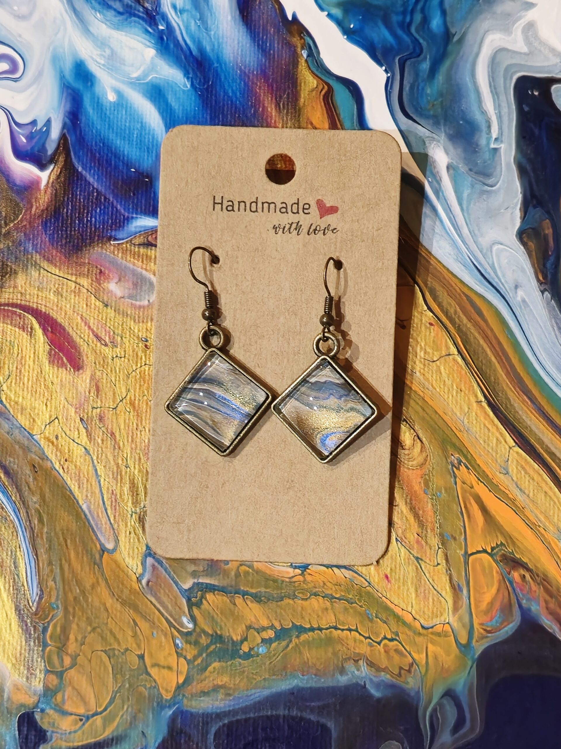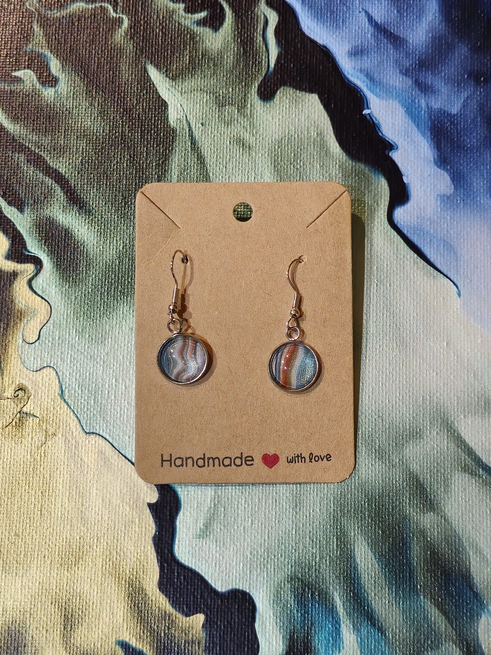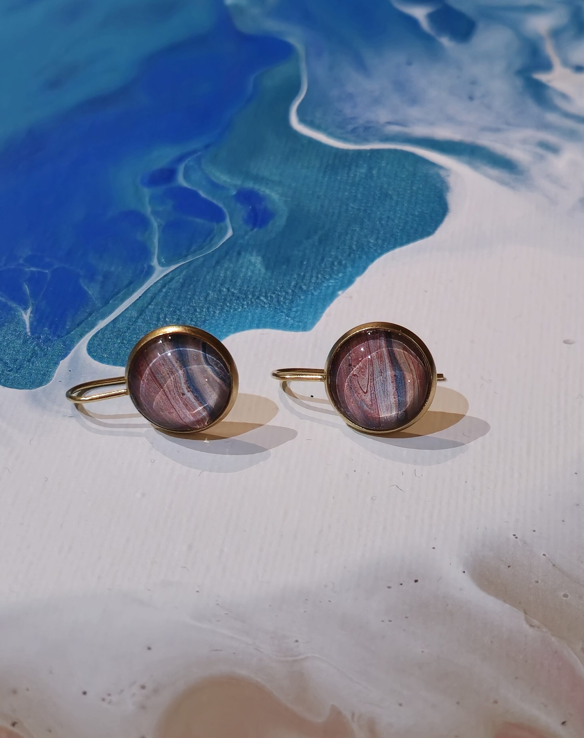 “Ogni orecchino è un’opera d’arte fluida in miniatura, sono realizzati in acciaio inossidabile con cabochon in vetro e colata acrilica di recupero dalle mie tele.”