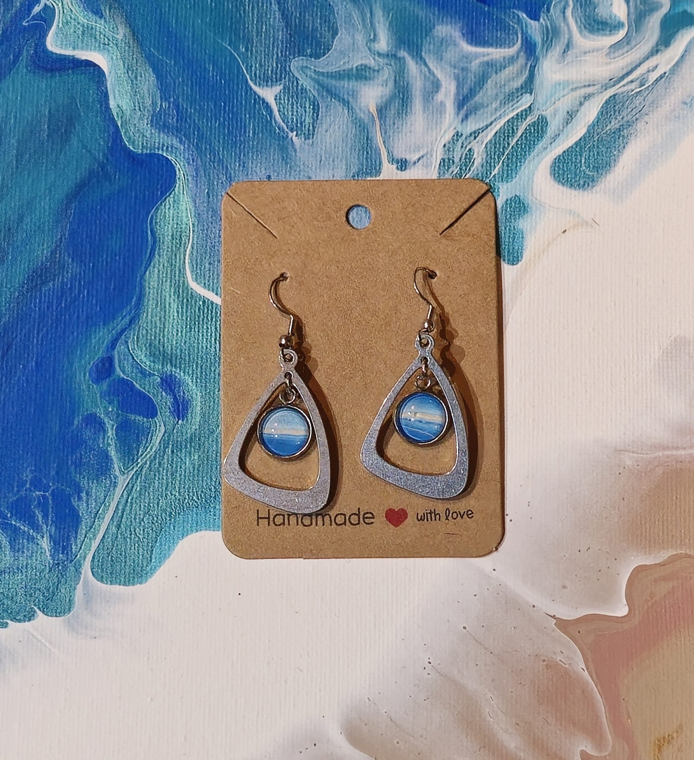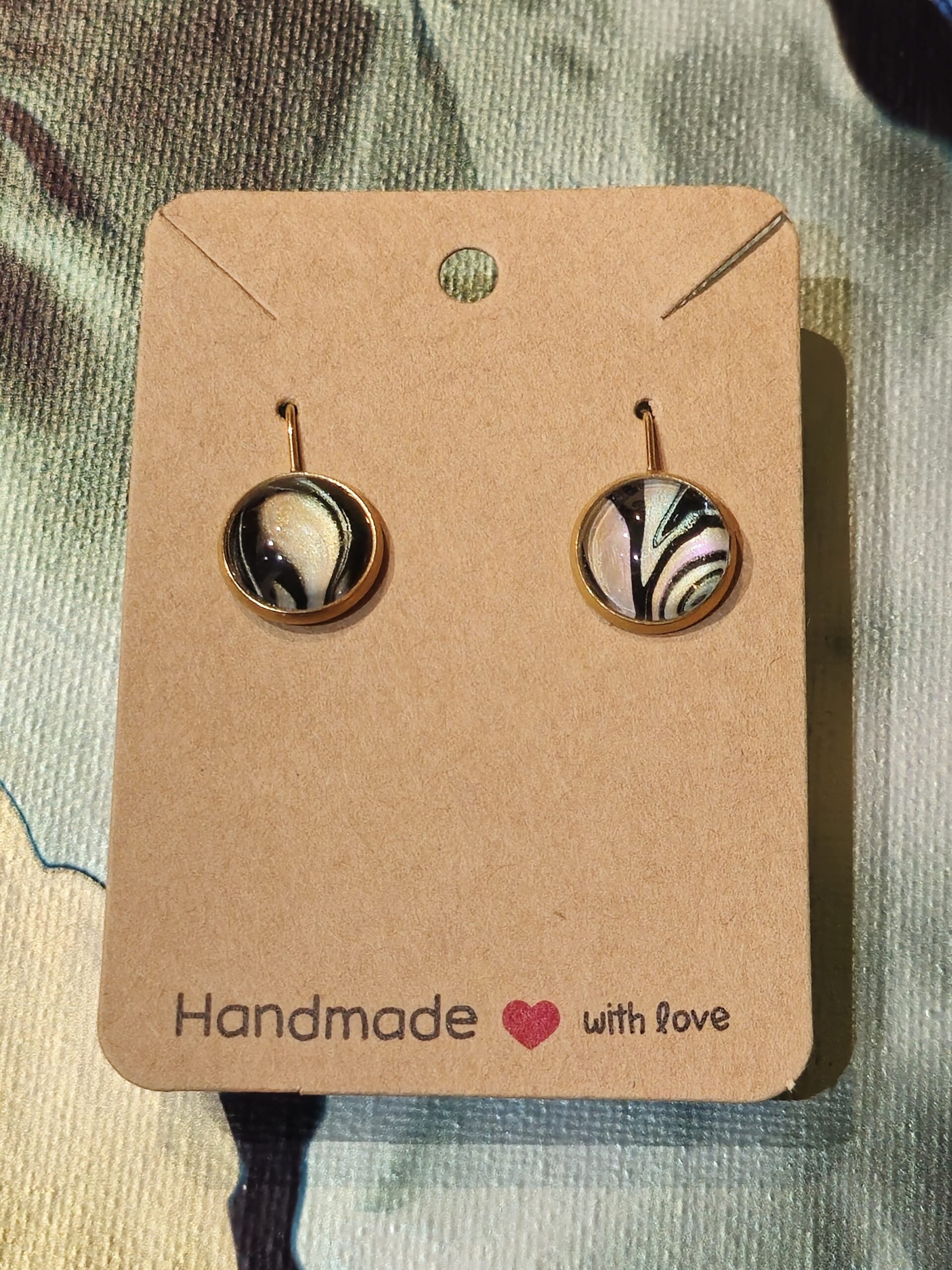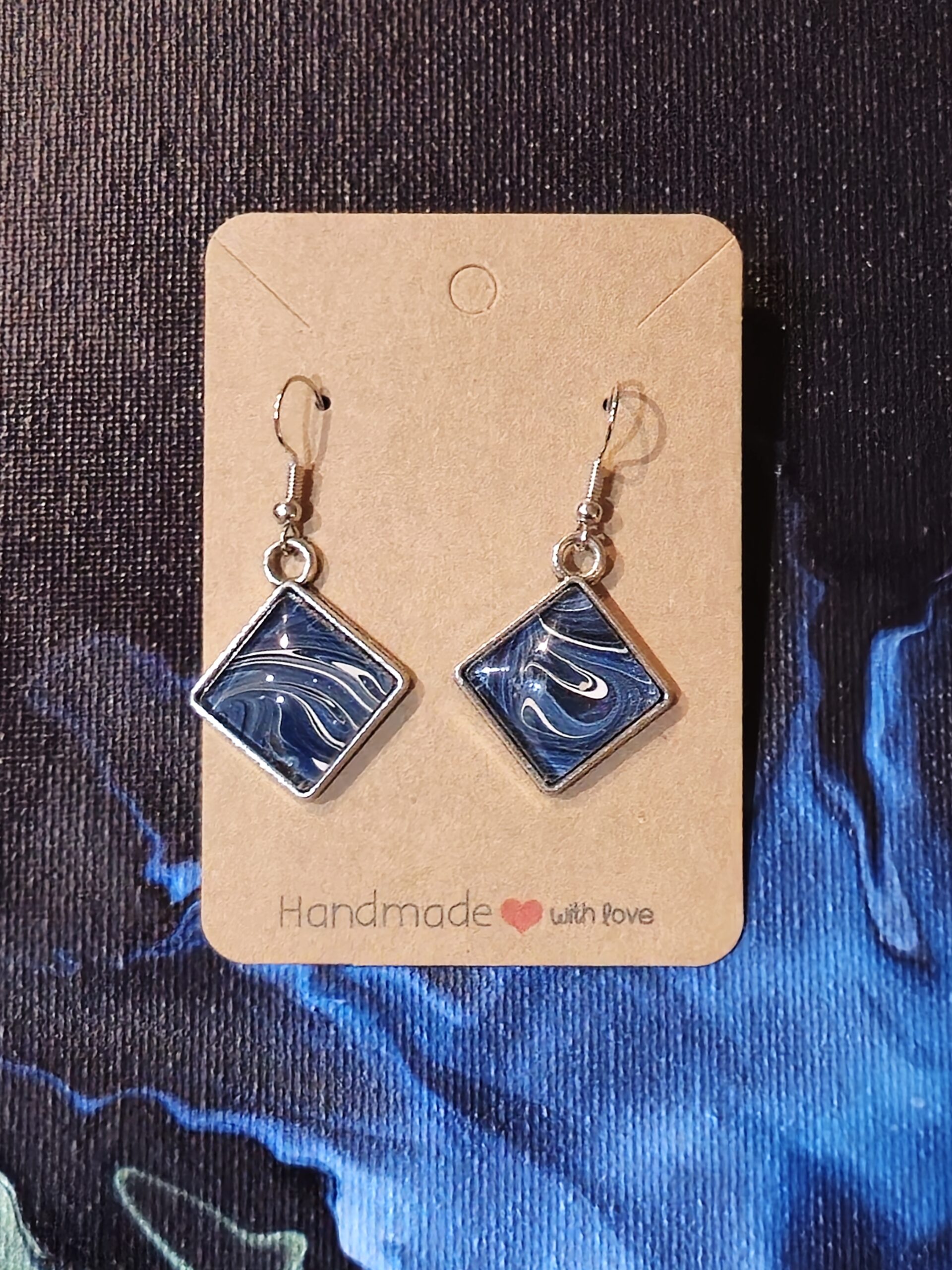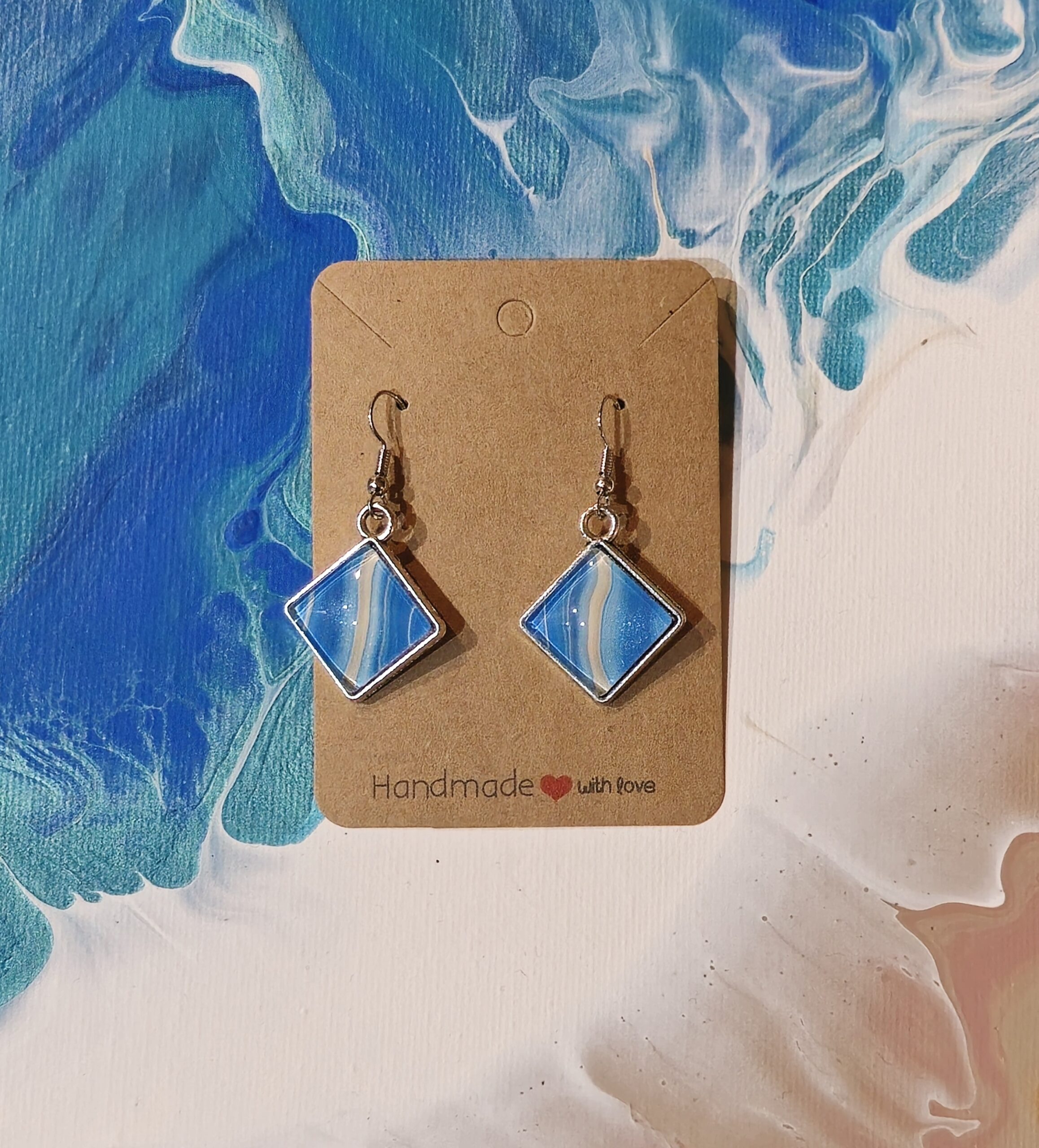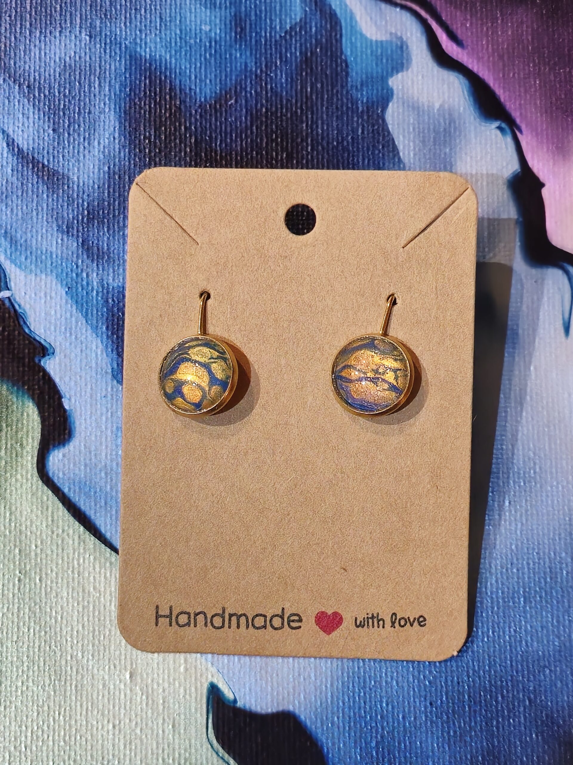 “Ogni orecchino è un’opera d’arte fluida in miniatura, sono realizzati in acciaio inossidabile con cabochon in vetro e colata acrilica di recupero dalle mie tele.”