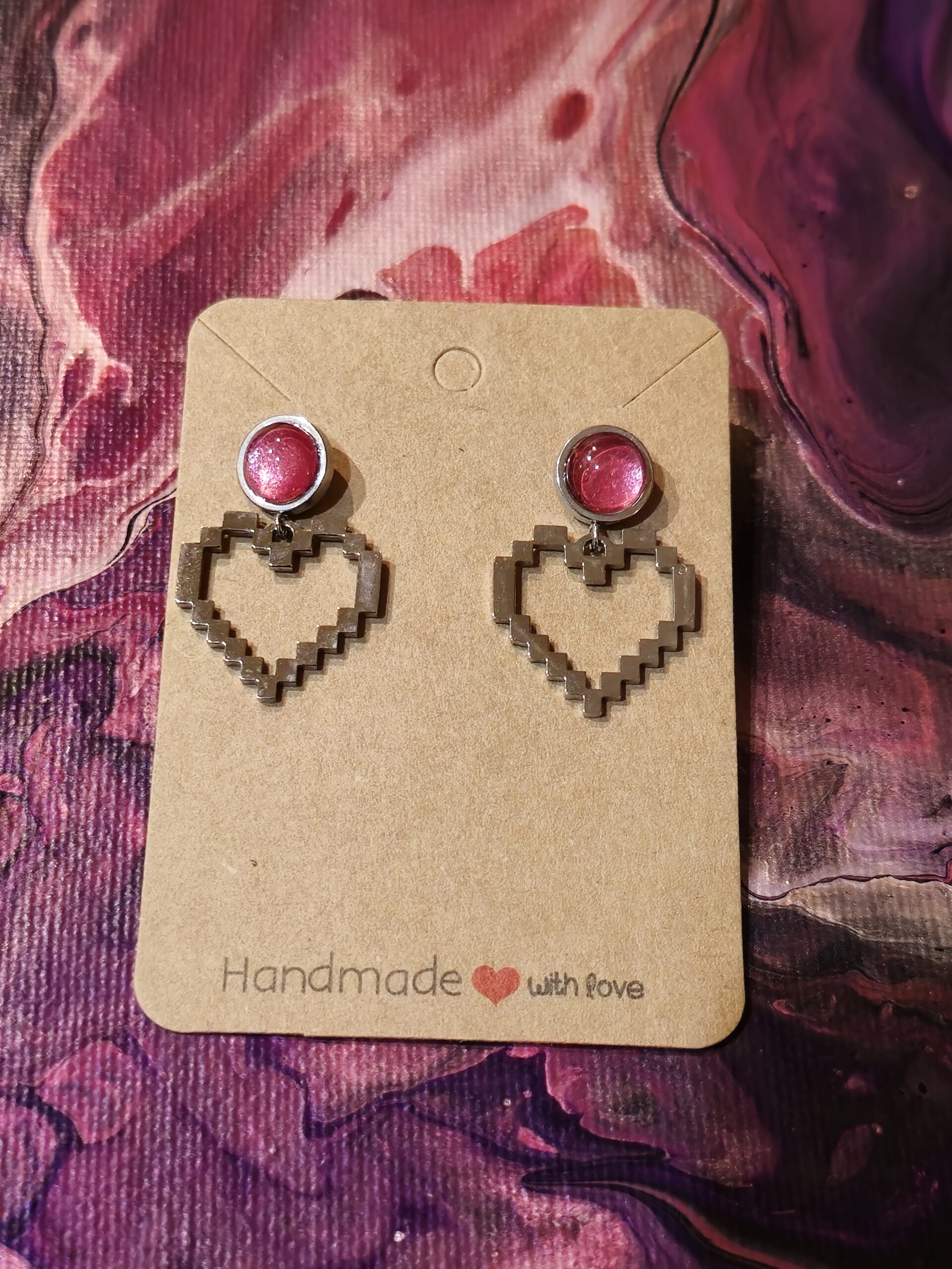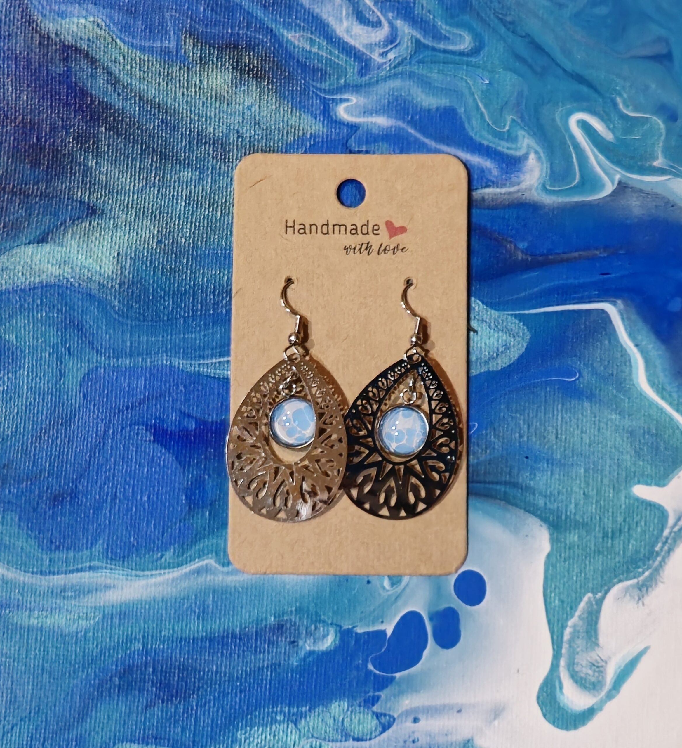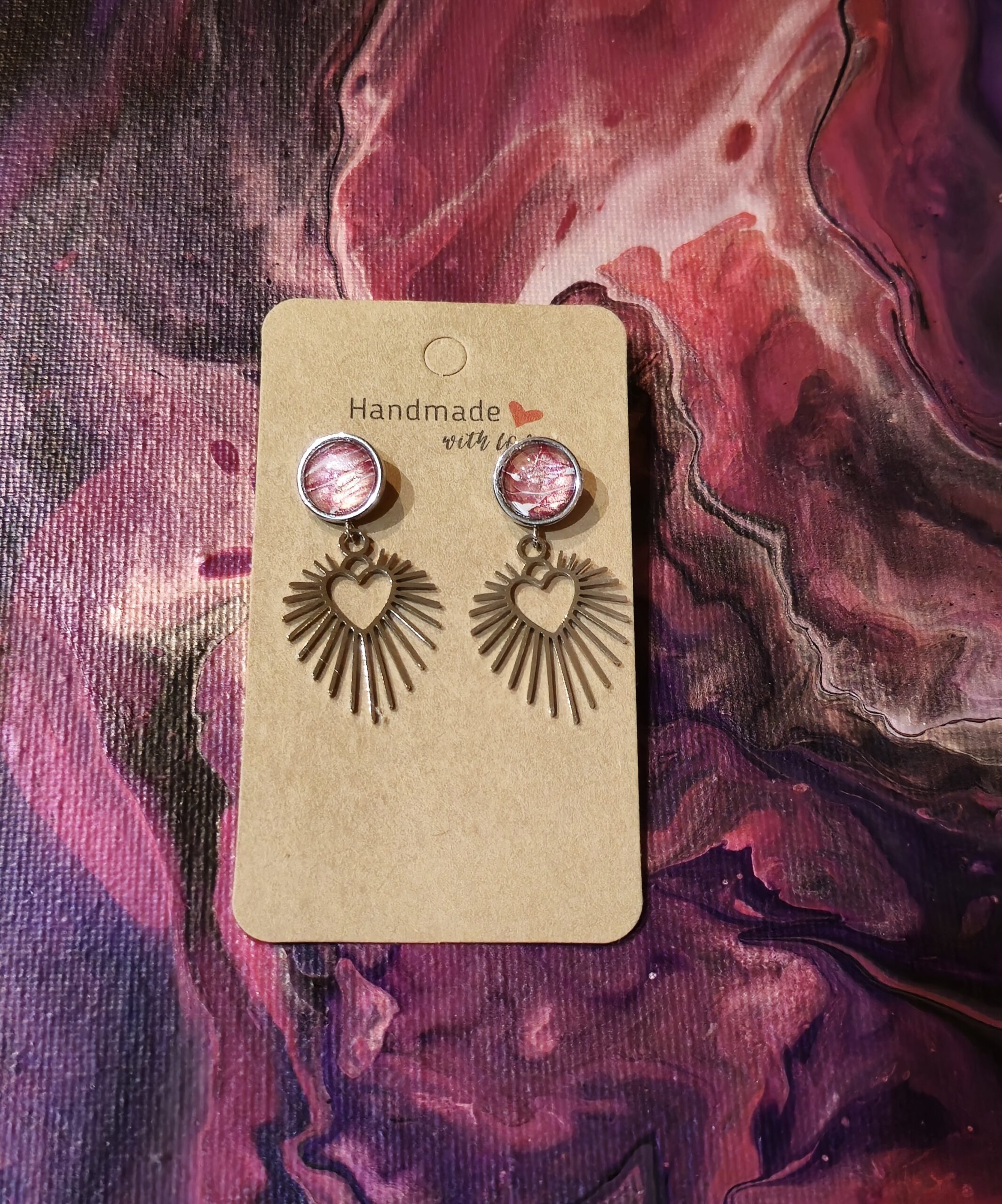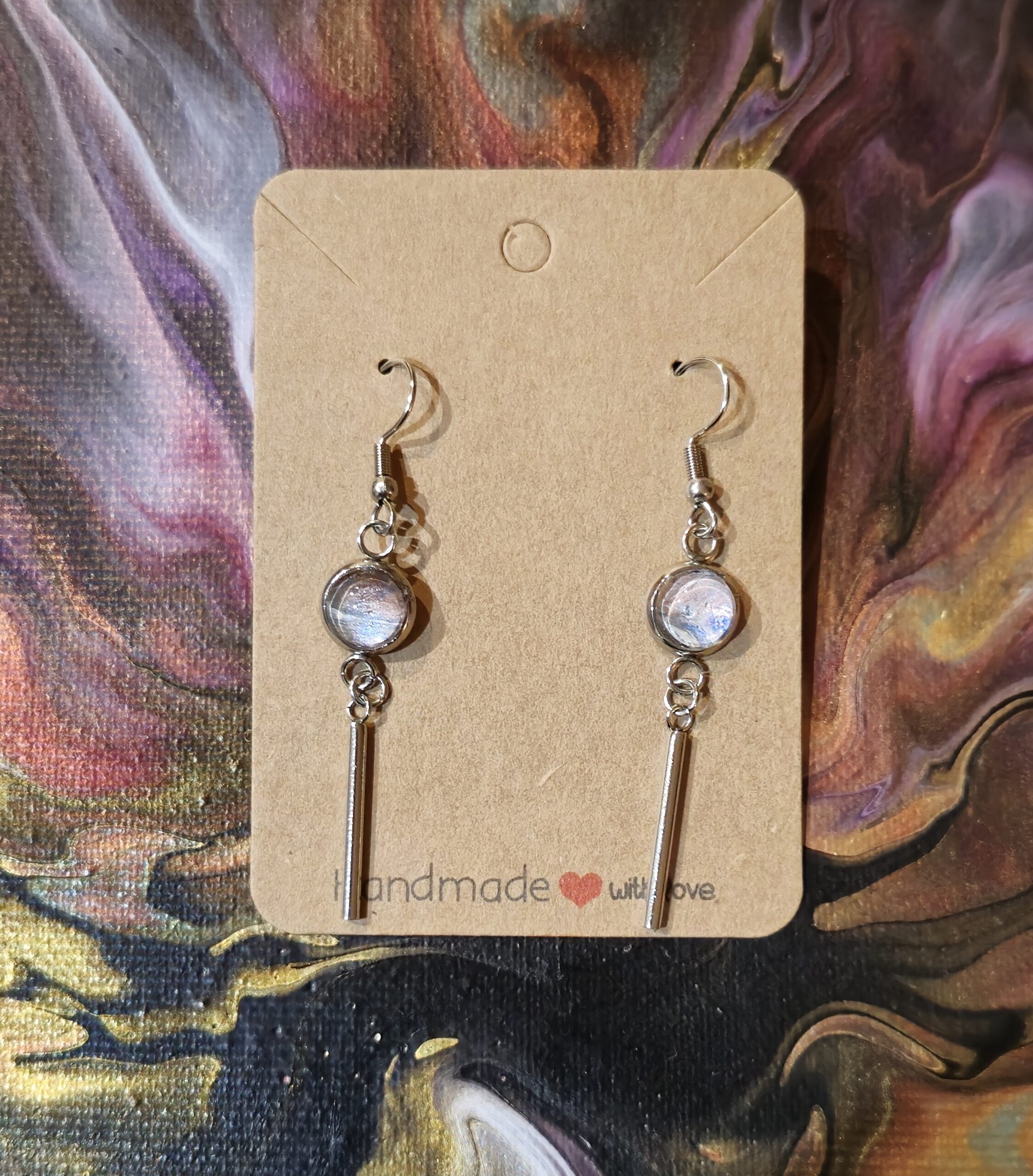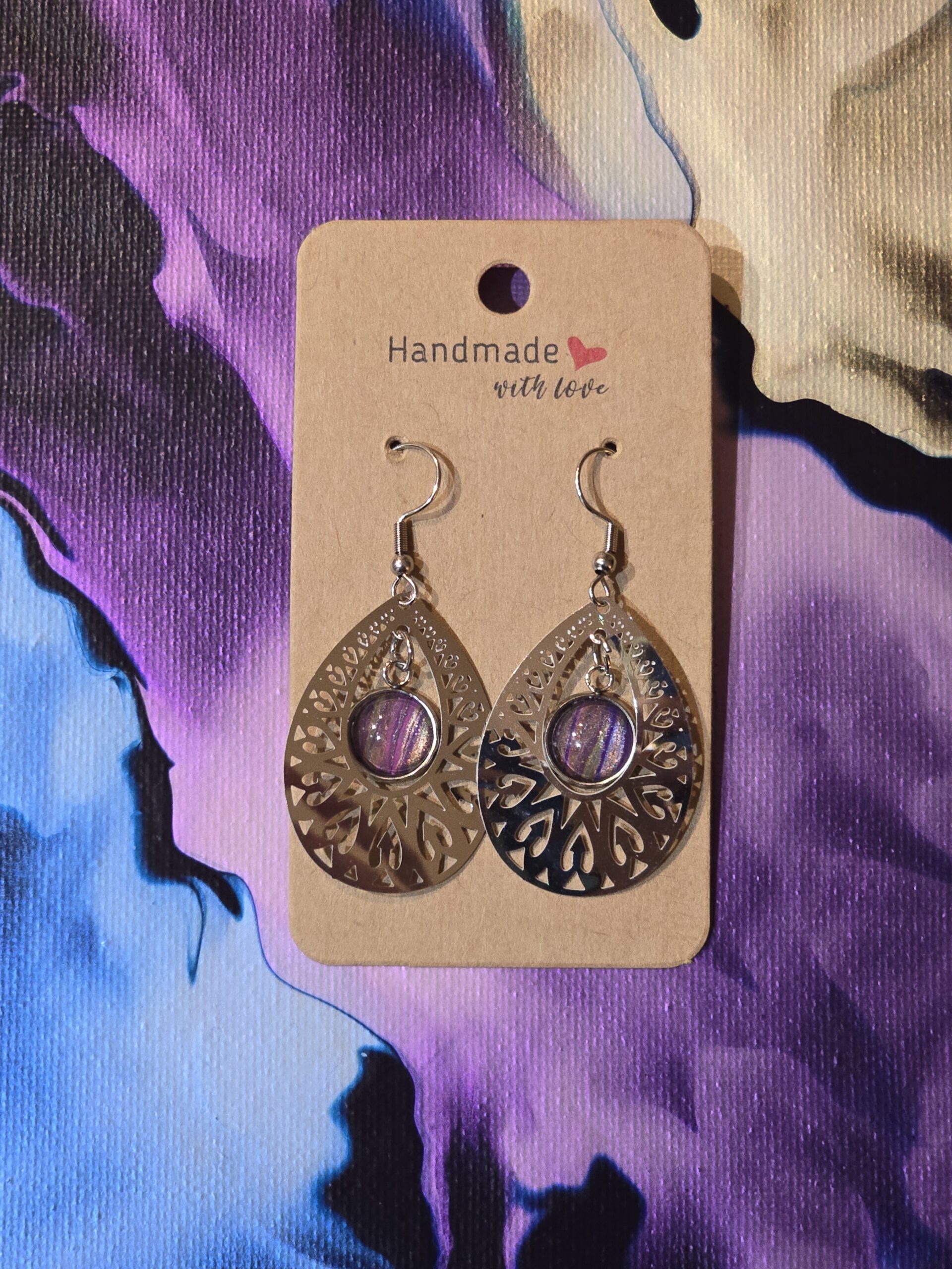 “Ogni orecchino è un’opera d’arte fluida in miniatura, sono realizzati in acciaio inossidabile con cabochon in vetro e colata acrilica di recupero dalle mie tele.”
