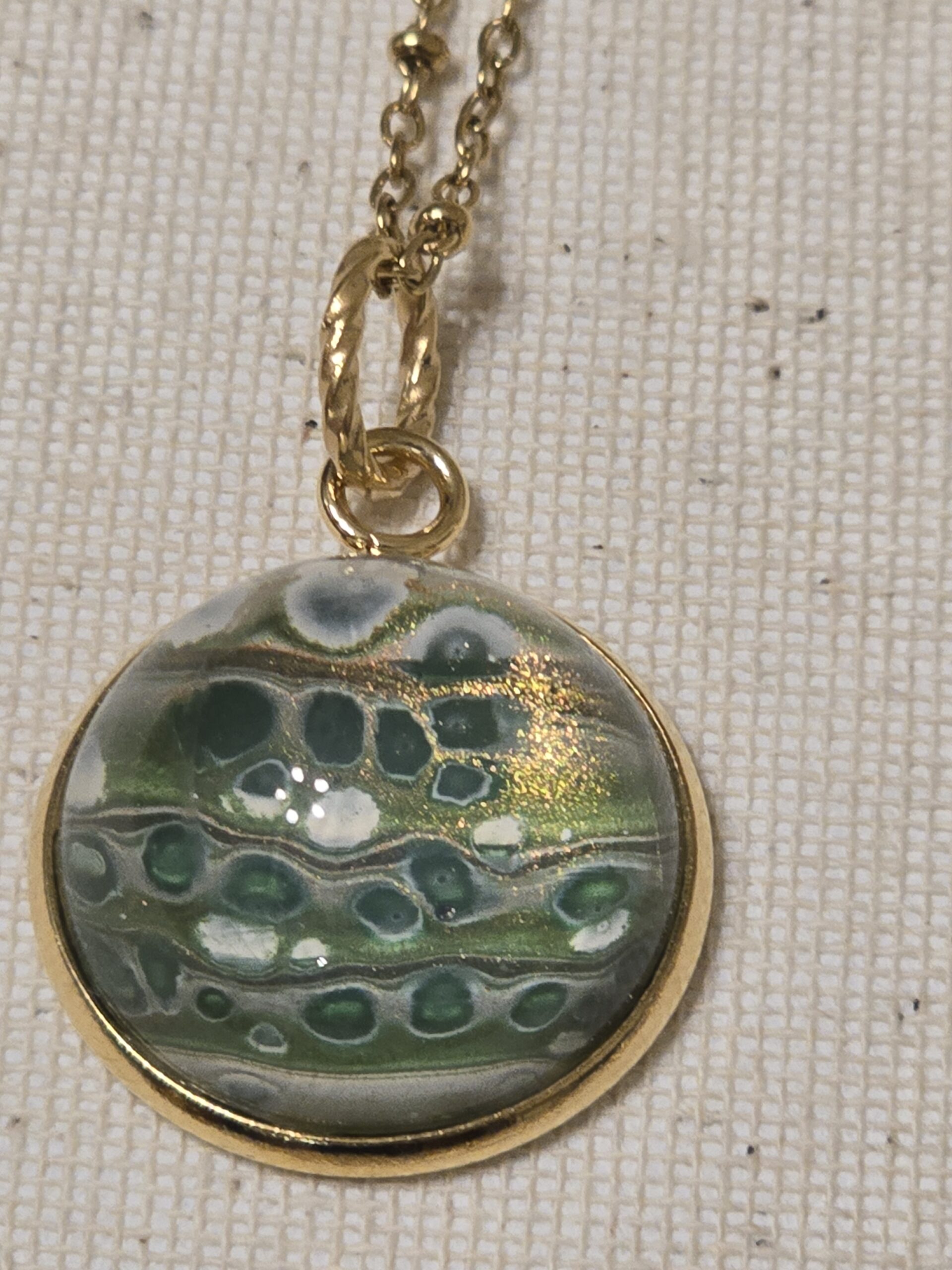 “Dalle mie tele nascono collane uniche: pellicole di vernice acrilica trasformate in cabochon di vetro. Indossa ogni giorno un frammento della mia arte!”